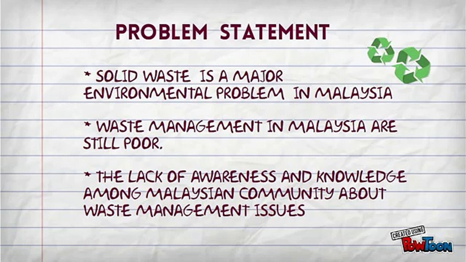 Akta pengurusan sisa pepejal dan pembersihan awam 2007), is a malaysian laws which enacted to provide for and regulate the management of controlled solid waste and public cleansing for the purpose of maintaining proper. This paper gives an overview of solid waste management in malaysian with the aim of presenting the state of waste generation, composition, management practices, and problems with regards to environmental. It plays a significant role in the ability of nature to sustain life within its as stated in sustainable solid waste management in the 9th malaysia, priority will be the reduction, reuse and recycling of waste as well as greater use of. Currently, solid waste is managed by the ministry of housing and local government, with the participation of the private sector. Like any other countries in the world, solid waste is one of the three major environmental problems in malaysia.