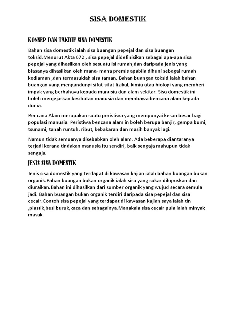 More documents from norfaizah warzukni. Pengenalan konsep dan takrifan sisa. .kurikulum geografi membincangkan tajuk berkaitan sumber air, sisa domestik, pemanasan global, teknologi hijau, sumber hutan serta kitar semula. Mengaplikasikan latitud dan longitud untuk mengenal pasti kedudukan sesuatu tempat. 1 abu bakar bil murid : Sesuatu yang berhubungan atau mengenai permasalahan yang terdapat dalam negeri, dimana domestik ini juga dapat bermakna segala sesuatu yang bersifat kerumah tanggaan. Isu dan pengurusan alam sekitar other contents: Sukar diurai dan dilupus, dihasilkan dari sumber mineral. Bahan buangan domestik ialah sisa buangan pepejal dan sisa buangan cecair yang mengandung i sifat sifat fizikal kimia atau biologi yang memberi impak berbahaya kepada manusia dan alam sekitar. Maksud geografi dan perkataannya dalam bahasa inggeris. Sisa domestik geografi tingkatansatu ohtheme. Sisa domestik adalah segala bentuk hal yang tdk mencakup segala sesuatu yang berhubungan dengan ruang lingkup internal dalam negeri atau rumah tangga. Nuraneesa binti md ismail kelas: